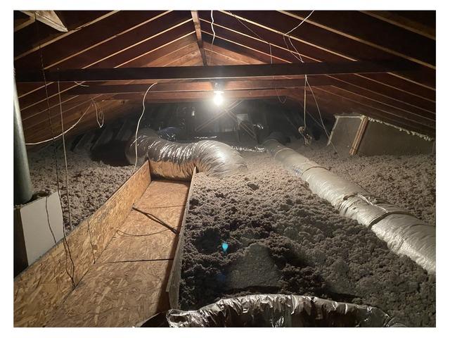 Complete attic transformation. The Triple H Crew started by removing the old insulation than air sealing the air leaks in the attic. After that, the crew added boards/barriers to create a mechanical catwalk, for easy access to the AC unit. Then they blew in 14" of cellulose insulation.